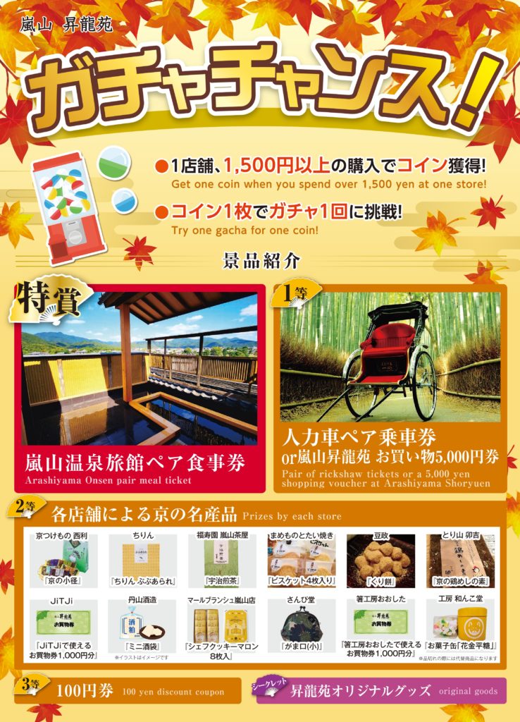 また、昇龍苑でお買い物をされたお客様を対象にした“秋の昇龍祭”ならではのキャンペーンや、地元・嵯峨野が誇る伝統芸能団体による演舞の披露など、多数のイベントで盛り上がる嵐山昇龍苑へお越しください。