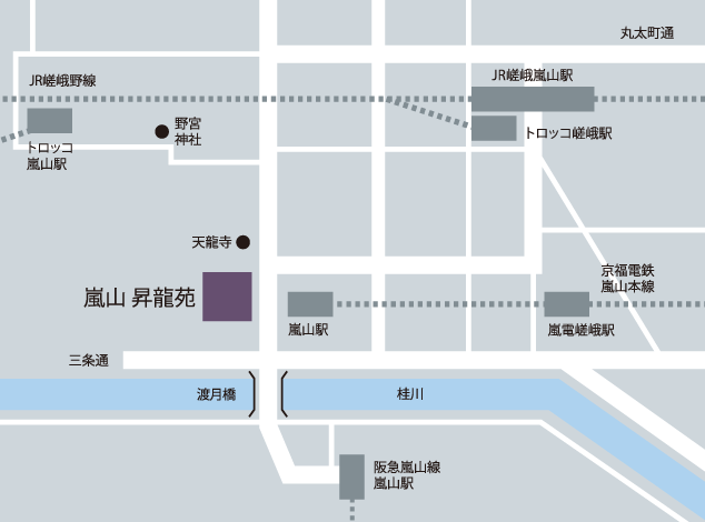 - JR京都駅より約30分(最寄り駅:JR嵯峨嵐山駅、阪急 嵐山駅、京福線 嵐山駅)