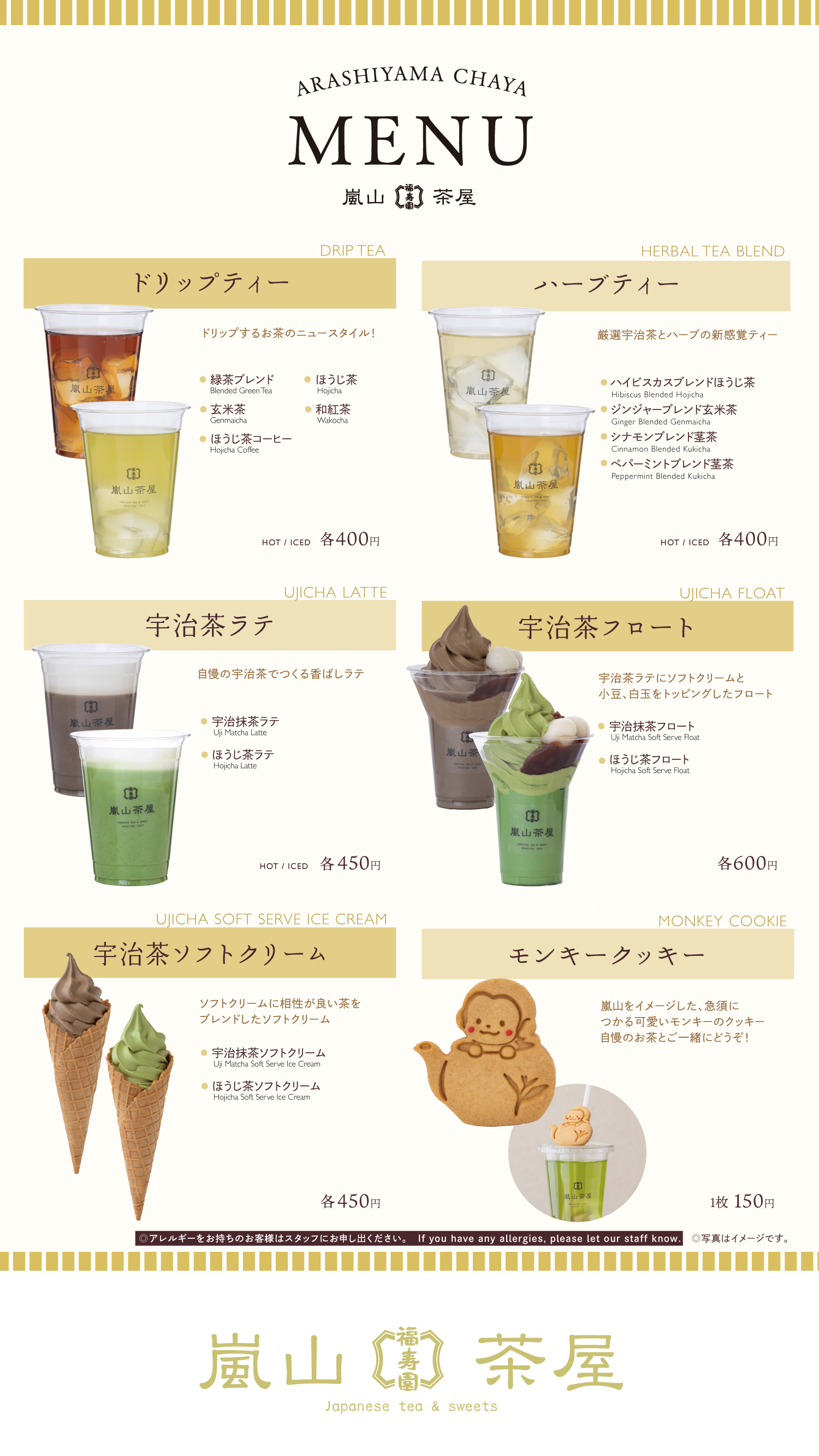寛政2年創業の宇治茶の老舗 福寿園が手がける新店舗。店内には、福寿園が自信をもっておすすめする、厳選された茶葉から生まれる優雅な味わいが特徴の宇治茶や、移り変わる嵐山の四季をイメージした嵐山茶屋オリジナル商品をはじめ、抹茶をふんだんに使用した香り豊かな抹茶スイーツも楽しんでいただけます。