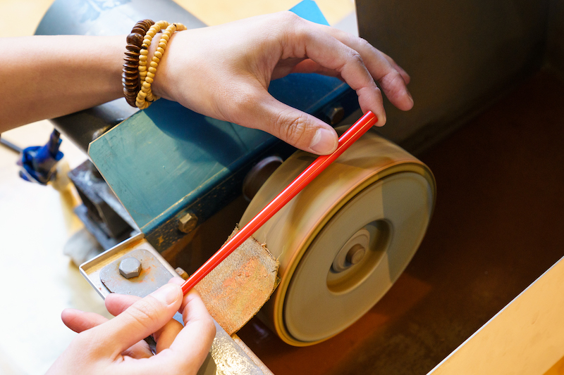 箸を作ることができます。 所要時間も値段も記念品にはもってこい。 砥石でお箸の